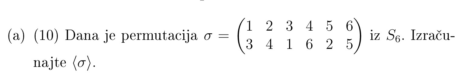 Bok svima, jel mi može netko pomoći oko ovog zadatka, razbijam glavu na njemu vec par dana, znam da je nesto lagano, ali nikak da skuzim. Ja sam izracunao da je permutacija reda 4, al kak dalje?