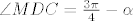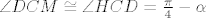 Zamislimo da je zadatak rijesen. Uz oznake kao na slici lako vidimo da je [latex]\triangle HBC[/latex] slican [latex]\triangle ABC[/latex] pa je kut [latex]\alpha = \angle CAB \cong \angle HCB[/latex]. S druge strane, za tezisnicu nad hipotenuzom vrijedi [latex]2t=c[/latex], pa je [latex]\tiangle AMC[/latex] jednakokracan, tj [latex]\angle CAB \cong \angle MCA[/latex]. Kako je pravac [latex]MC[/latex] simetrala pravog kuta to su kutevi [latex]\angle DCM \cong \angle HCD = \frac{\pi}{4}-\alpha[/latex]. Sada se lako vidi i da je [latex]\angle MDC = \frac{3\pi}{4}-\alpha[/latex].