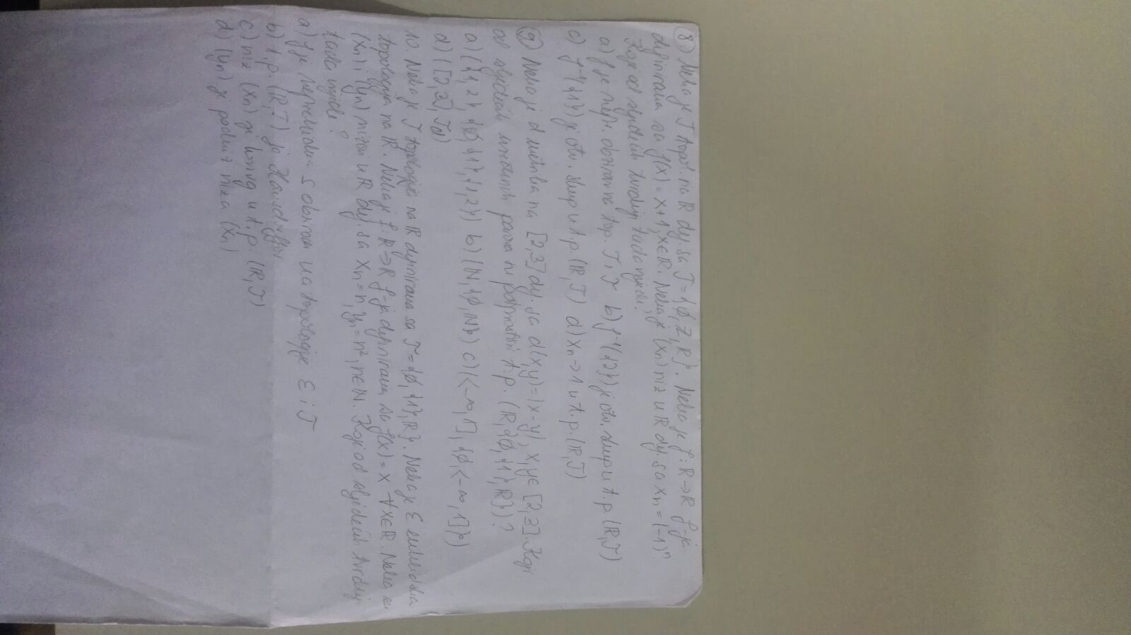 (b) je točno. Kada u domeni gledaš topologiju [tex]\mathcal{T}=\mathcal{P}(\mathbb{R})[/tex], onda je svaka funkcija neprekidna, bez obzira na topološki prostor u kodomeni. Konkretno, za [tex]Z\in \mathcal{Z}[/tex], imaš da je [tex]f^{\leftarrow}(Z)\in \mathcal{P}(\mathbb{R})[/tex]. (jer je očito [tex]f^{\leftarrow}(Z)\subseteq \mathbb{R}[/tex])