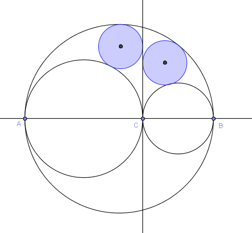 Konstruirajmo tri kružnice sa kolinearnim središtima tako da se dvije diraju izvana u nekoj točki C, a neka treća dira te dvije u točkama A i B.