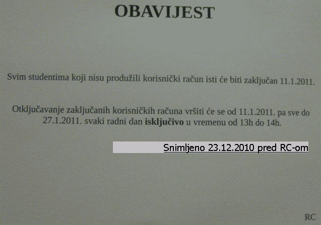 Prenosim [u]obavijest[/u] od RC-a o [b][size=15]produljivanju korisničkih računa[/size][/b], koju sam vidio u podrumu kod ulaza u Računski centar 23.12., u četvrtak dan prije Badnjaka.