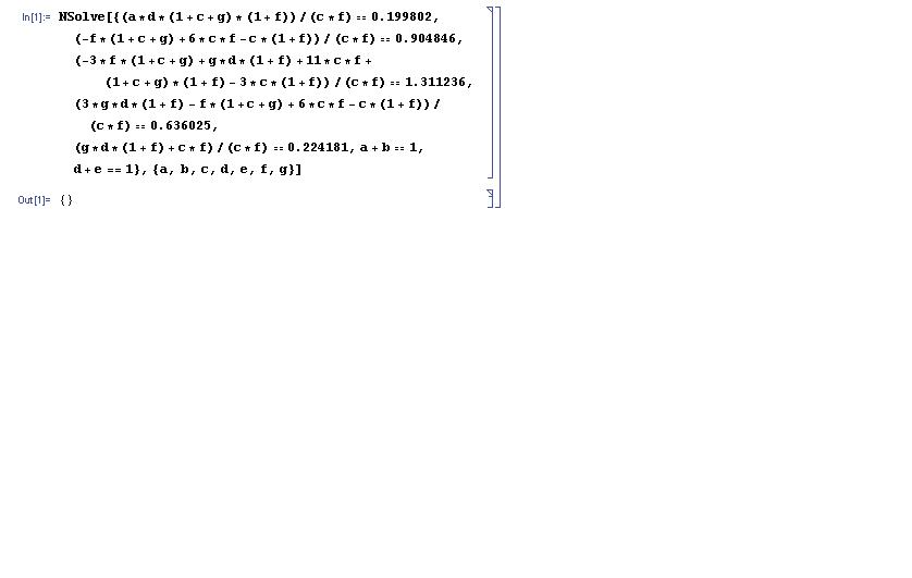 Solve[{(a*d*(1+c+g)*(1+f))/(c*f)==0.199802,